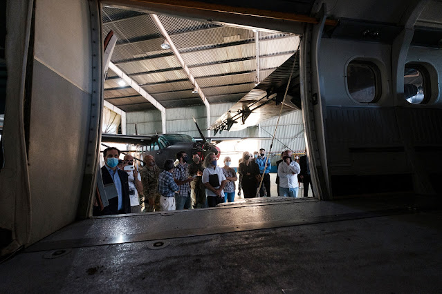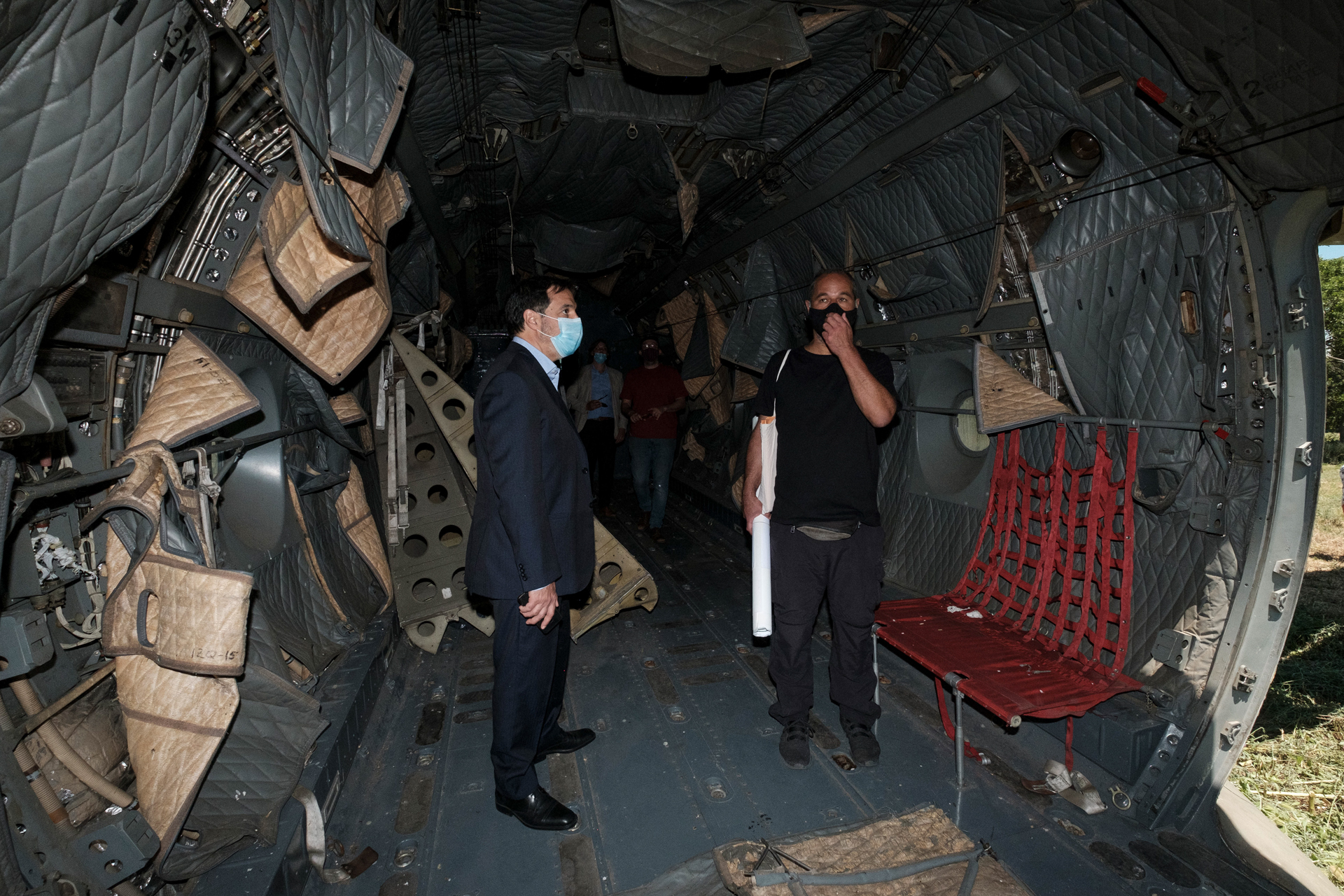 ☝ Dentro de la nave el estado de abandono por el paso del tiempo es notable. El juez Venditti dialoga con Marcelo Castillo, el integrante del EAAF que también guió la visita y contó cómo fueron los trabajos realizados por el Equipo Argentino de Antropología Forense entre la zona de lo que fue el Centro Clandestino de Detención Tortura y Exterminio El Campito y el aeródromo del Batallón.
