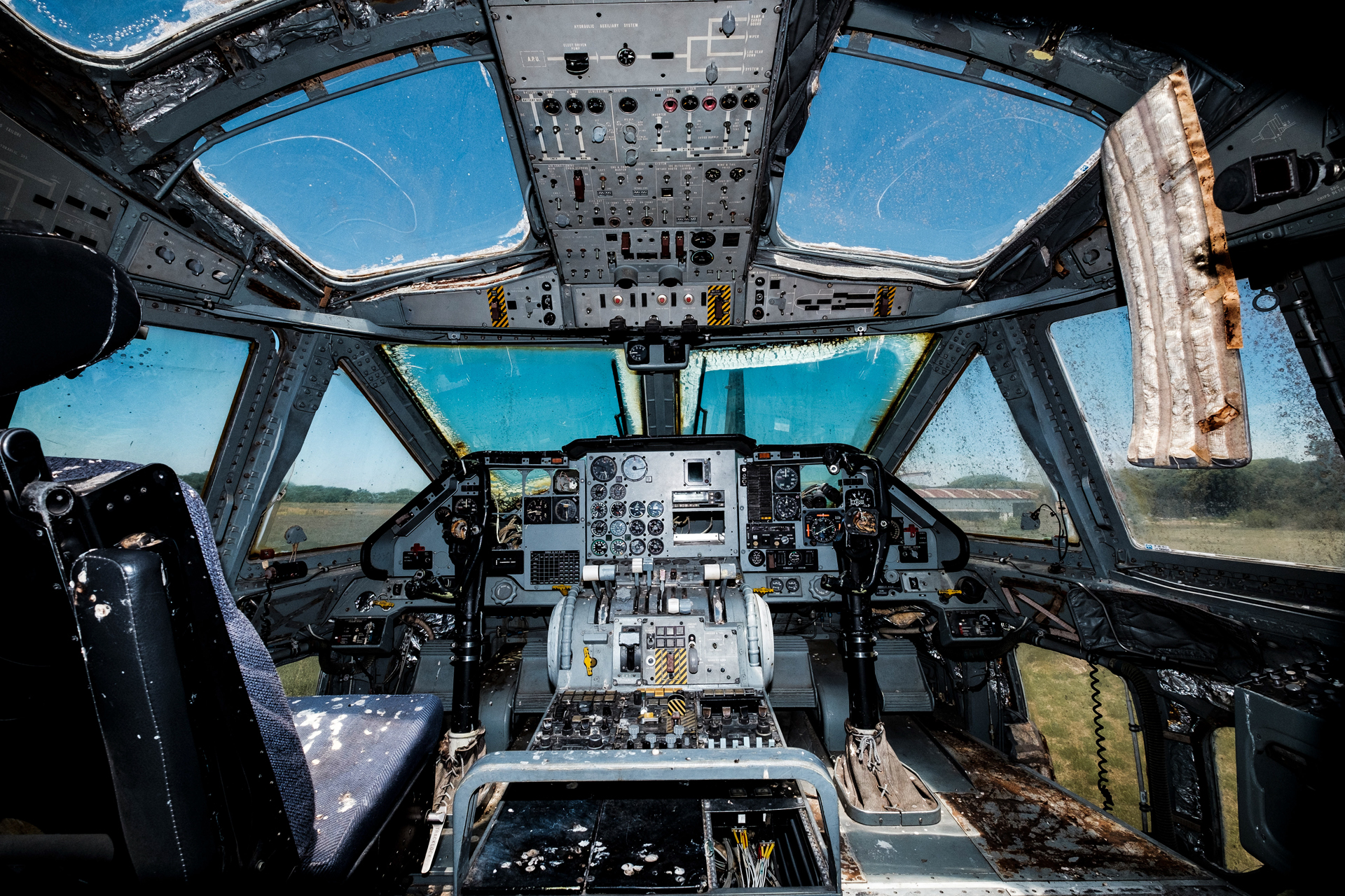 📷 Gustavo Molfino/La Retaguardia☝ Los controles de la cabina del Fiat G-222 patente E-261, que fue utilizado según los registros en vuelos de la muerte. Permanece enterrado en un pastizal junto a otros dos aparatos del mismo modelo. «Este avión estuvo en Malvinas al comando de alguien que está aquí», dijo el oficial Bennardi, a cargo de guiar a la comitiva. «¿Usted?», le preguntó el presidente del tribunal, Walter Venditti. «No, el señor Malacalza», respondió el militar, en referencia al imputado que estuvo presente durante la visita, pero que no estaba allí en ese momento.