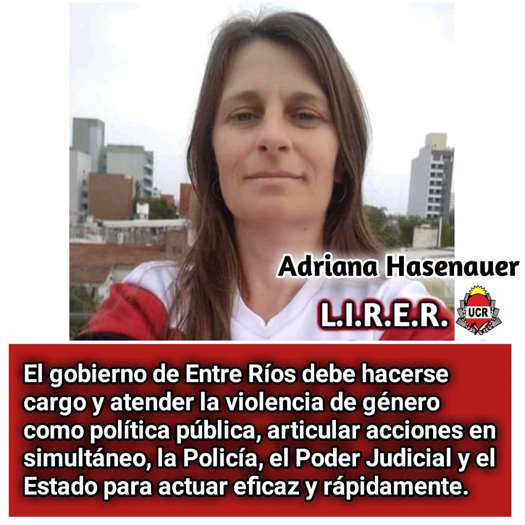 Adriana Hasenauer dirigente de Línea interna Radical Entre Ríos (LIRER UCR) expresa que: el gobierno de Entre Ríos debe hacerse cargo y atender la violencia de género como política pública, articular acciones en simultáneo, la Policía, el Poder Judicial y el Estado para actuar eficaz y rápidamente.