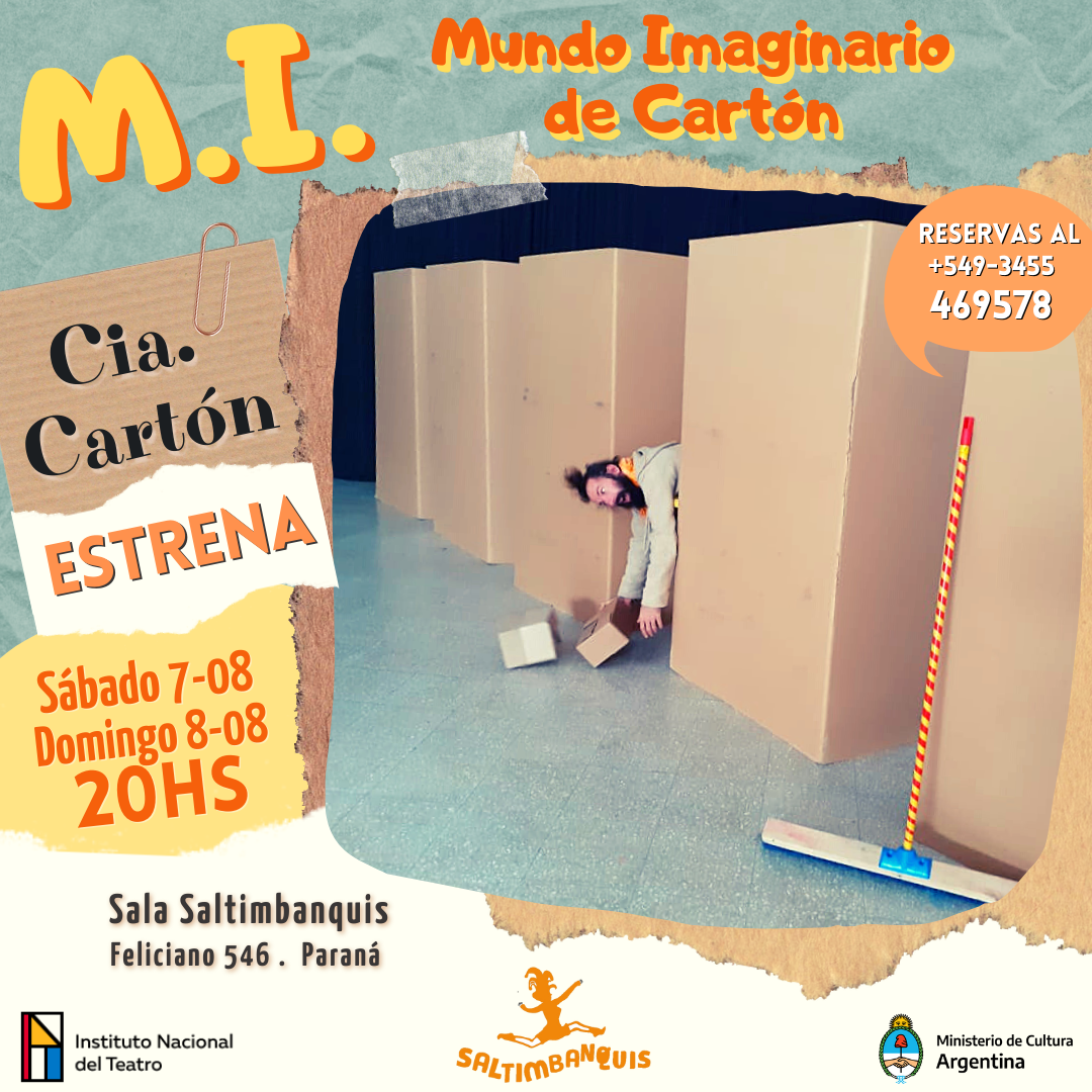 Este sábado 7 y el domingo 8 de agosto a las 20:00 hs, en la Sala Saltimbanquis (Feliciano 546), Compañía Cartón estrenará la obra «M.I. Mundo Imaginario de cartón». La actividad es la gorra y está sujeta a los protocolos sanitarios, por lo que la capacidad es limitada y se requiere hacer la reserva por whatsapp al 3455-469578.