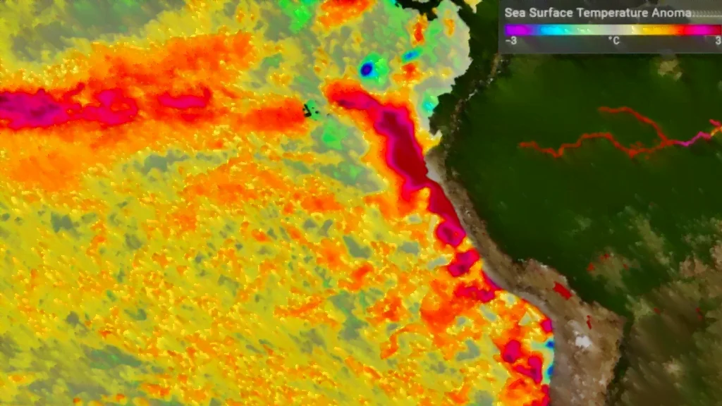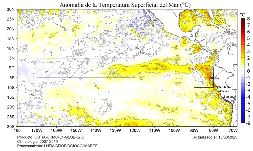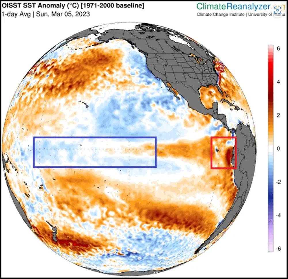 Tras tres años del fenómeno de La Niña, el Pacífico central oriental y frente a las costas de Perú y Ecuador aparecen floraciones de agua más cálidas de lo normal, las primeras señales de un fenómeno de El Niño que se prevé que se fortalecerá durante el verano de 2023. Así lo muestra la imagen inferior.