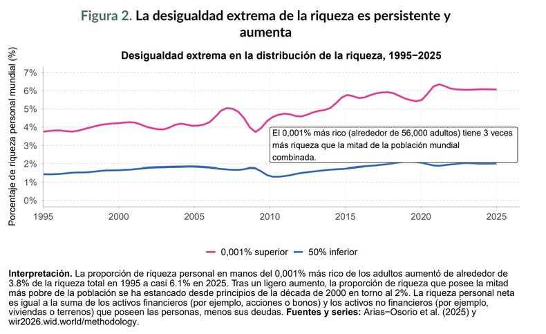 Elon Musk, Jeff Bezos, Mark Zuckerberg, Sam Altman y otros 56.000 multimillonarios tienen, en conjunto, un patrimonio que triplica al que suma la mitad de la humanidad. El dato, que surge del Informe sobre Desigualdad Global, de Thomas Piketty y otros investigadores, expone la concentración extrema de la riqueza que celebra y favorece activamente Javier Milei.