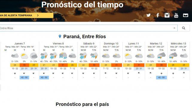 En la provincia, el SMN prevé lluvias y tormentas fuertes para este viernes y sábado en las localidades de Paraná, Concordia, Gualeguaychú, Colón, Villaguay, La Paz, entre otras localidades.