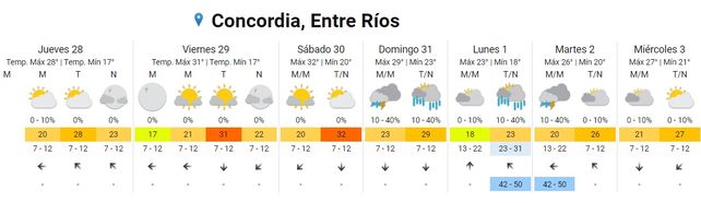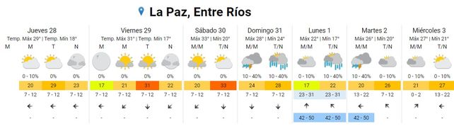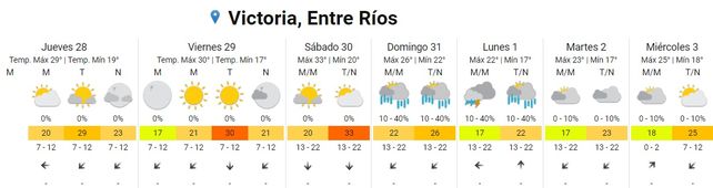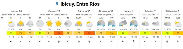 El domingo habrá un leve descenso de temperaturas promedio con una mínima de 24 y una máxima de 28 grados. Se esperan tormentas aisladas por la mañana y chaparrones por la tarde y noche. El viento soplará del sector norte.