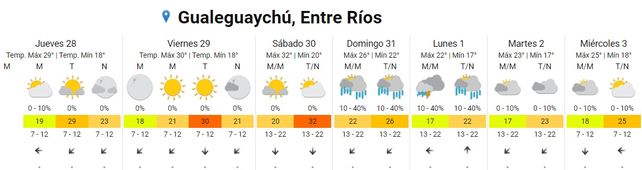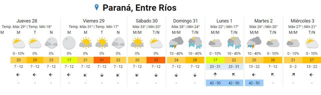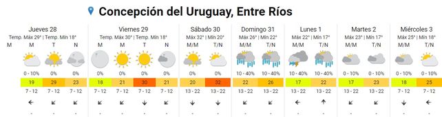 Para el viernes, el termómetro marcará una mínima promedio de 17 grados y una máxima de 31. El cielo estará algo nublado durante toda la jornada y los vientos soplarán del este rotando al noreste.